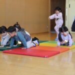 作り終えたバッグを積み重ねて、バランスゲームを行うお子様方!