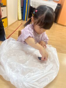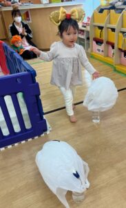 ビニール袋に目と口を貼ってにっこりおばけ、びっくりおばけが出来上がりました。