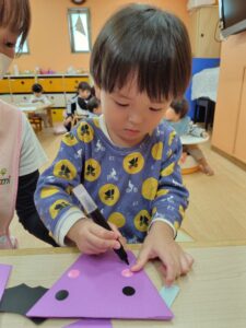先日、ハロウィンパーティーに向けて制作を行いました。