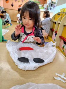 ビニール袋に目と口を貼ってにっこりおばけ、びっくりおばけが出来上がりました。