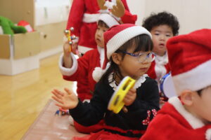 さて、まずはクリスマスソングに合わせて鈴とタンバリンを使って合奏を行いました♫