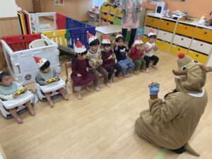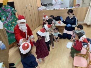 サンタさんのお話をしたり完成した帽子をかぶって合奏をしていると・・・