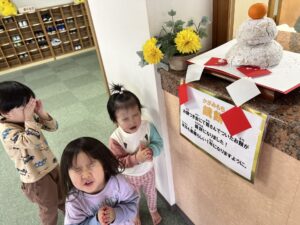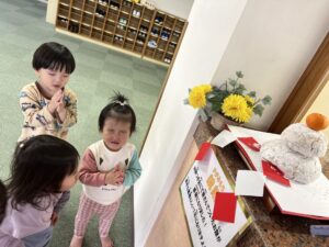 年末に幼稚園へ遊びに行った際、玄関先の鏡餅に来年が良い年になるようお願いをして来ました!