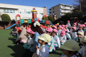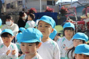 園長先生が木槌で鏡開きを行う様子を、静かにそして興味津々の表情で見守っていたお子様方。