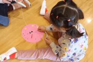 体操後の制作活動はヘビのくるくる凧を作って遊びました。