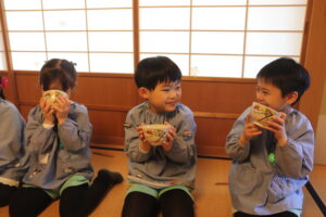 この日のお菓子はしるこサンドと栗饅頭でした。ほとんどのお子様が食べることができました✨