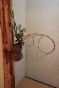 今月のお花は椿・水仙・枝垂柳です。丸くなっているのは、良いことが長く続きますように、という意味が込められているそうです。