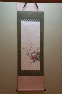 白梅、椿、鶯が描かれた春らしい掛け軸です。