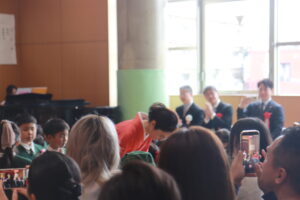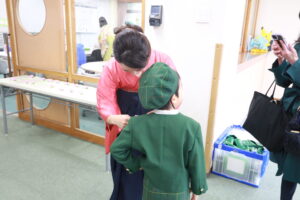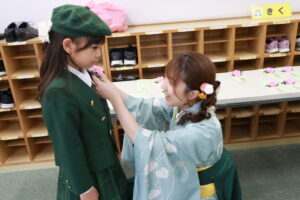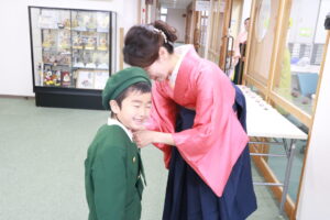 担任の先生の顔を見ると笑顔になり、胸にお花をつけてもらい嬉しそうな姿が見られました。