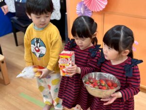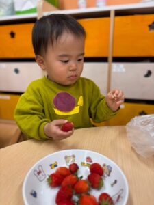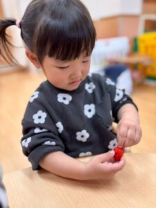 優しい手つきでイチゴを持ち、上手にヘタを取ることができました(^O^)