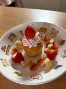 おやつでは、みんなでヘタを取ったイチゴを使ったスペシャルカップケーキを食べました😋