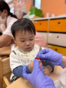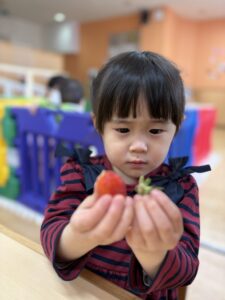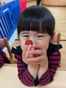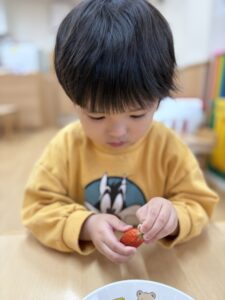 優しい手つきでイチゴを持ち、上手にヘタを取ることができました(^O^)