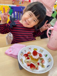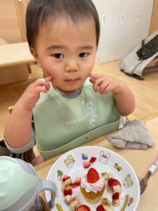 おやつでは、みんなでヘタを取ったイチゴを使ったスペシャルカップケーキを食べました😋